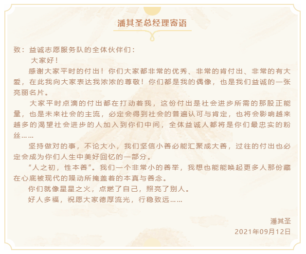 本次團建活動結(jié)束后,潘其圣總經(jīng)理特寄語全體志愿者伙伴,勉勵大家德厚流光,行穩(wěn)致遠: