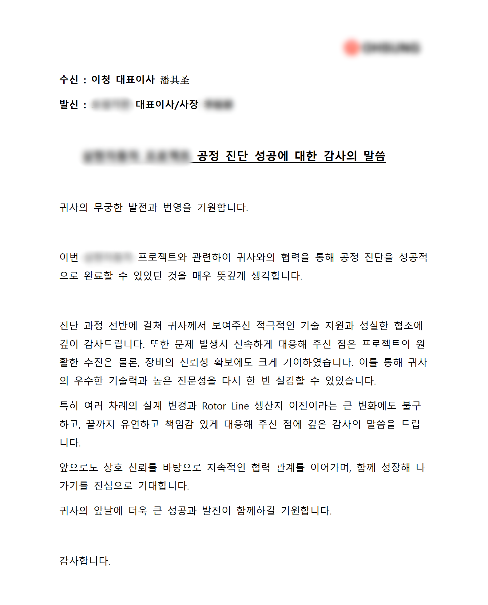 近日,益誠公司為某韓國知名客戶量身打造的汽車馬達(dá)自動(dòng)化生產(chǎn)線項(xiàng)目取得重要階段性成果,順利完成核心階段的全面工藝診斷工作。在該項(xiàng)目執(zhí)行期間,益誠團(tuán)隊(duì)?wèi){借高度定制化的解決方案、卓越的專業(yè)能力與出色的項(xiàng)目表現(xiàn),贏得了客戶的高度認(rèn)可,喜獲該客戶方發(fā)出的官方書面感謝信。