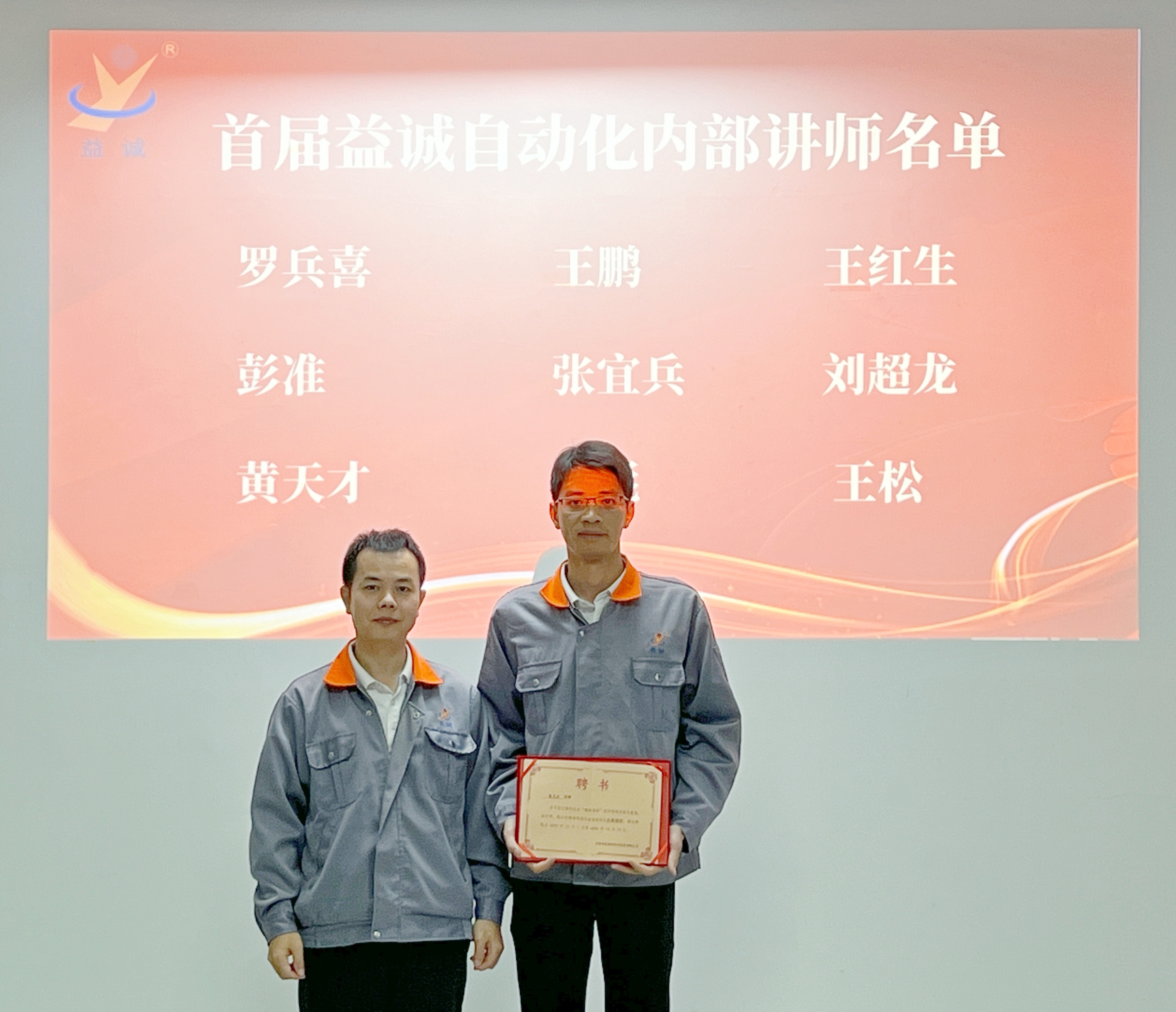 益誠(chéng)自動(dòng)化總經(jīng)理潘總親自為首批內(nèi)部講師頒發(fā)聘書,潘總勉勵(lì)大家:“這張聘書承載的不僅是榮譽(yù)與信任,更是責(zé)任與期待,希望大家成為公司智慧傳遞的橋梁,在教與學(xué)中激發(fā)思考,在傳與承中凝聚力量,為公司高質(zhì)量發(fā)展持續(xù)注入人才動(dòng)能。”